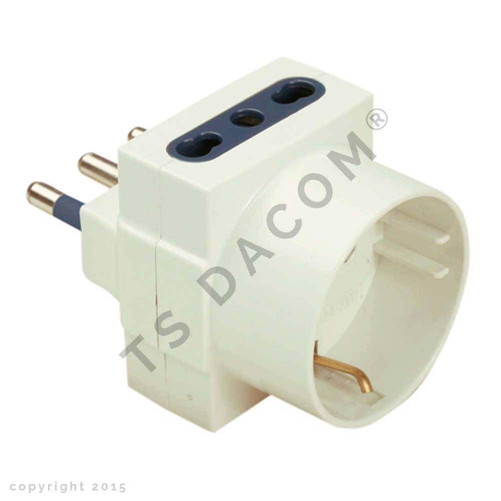 Adattatore a tripla con spina 16a, una presa schuko e 2 prese bivalenti, colore bianco