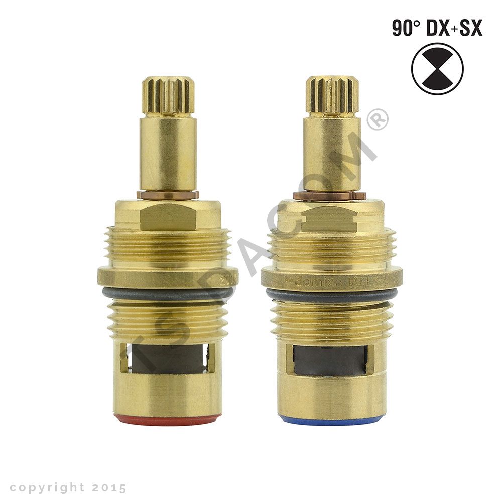 Kit vitoni ceramici di ricambio per vecchia rubinetteria tipo "mariani", asta Ø 9 x h 21 mm, broccia "o" con 17 denti, Øfil. basso 1/2" x Øfil. alto 22 x h 58 mm, vitone 90°sinistro + 90° destro
